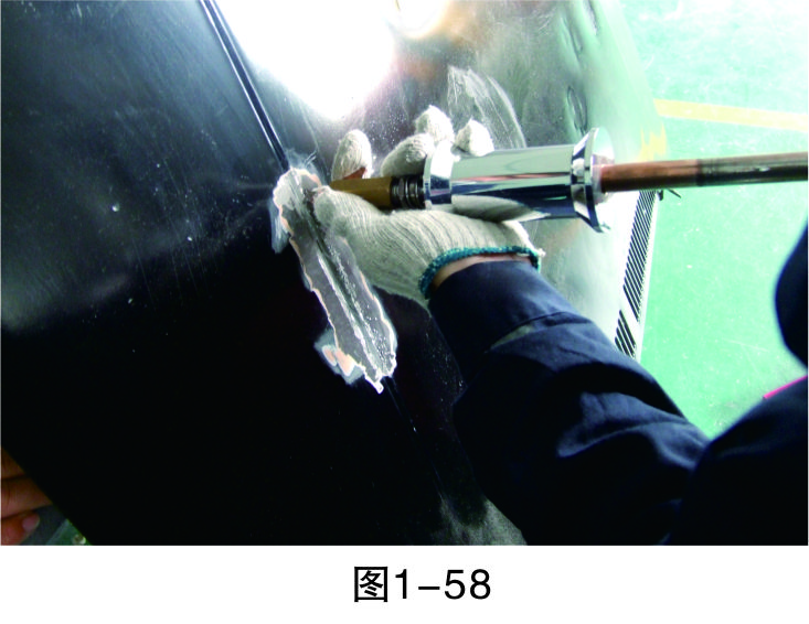 步驟3(除漆):打磨漆層,至板件金屬裸露后進(jìn)行清潔,然后再進(jìn)行鈑金作業(yè),如圖1-44所示。