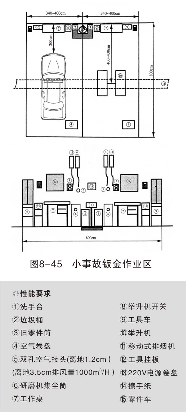 小事故作業(yè)區(qū)視維修業(yè)務(wù)量安排2~4個工位,每個工位設(shè)備設(shè)施齊全,能獨立完成板件損傷修復(fù)。