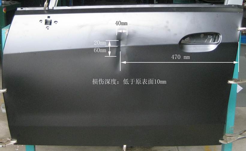 2013年車身修復大賽受損門板修復項目技術(shù)方案的補充說明 2013-05-16 19149 2013年車身修復大賽受損門板修復項目技術(shù)方案的補充說明 1、受損門板項目的受損位置及尺寸圖片、作業(yè)要求(1)作業(yè)要求在40分鐘內(nèi),對雪佛蘭新賽歐左前門外板上的長80mm,寬40mm,深10mm的條形凹陷(漆膜已破壞)進行修復,凹陷損傷穿過車身線。