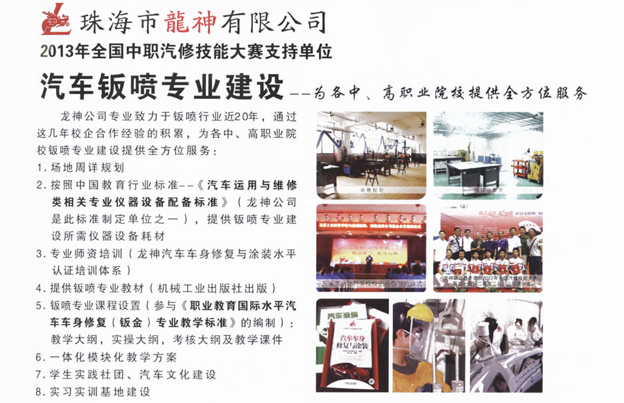 龍神汽車車身修復與涂裝 水平認證培訓體系 2013-06-03 25372 龍神公司專業(yè)致力于鈑噴行業(yè)近20年,通過這幾年校企合作經(jīng)驗的積累,為各中、高職業(yè)院校鈑噴專業(yè)建設提供全方位服務。