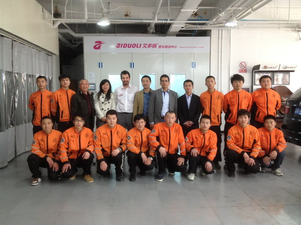 本司訊:2013年4月北京晴空萬里,龍神公司特邀英國專家一行五人,來到了北京車爵士進(jìn)行汽車噴涂遮蔽技術(shù)交流。首先公司一行了解車爵士的汽車噴涂情況及詢問了使用的遮蔽工具情況。隨后英國專家針對在汽車噴漆時難噴涂的車門縫隙、玻璃死角等地方的專業(yè)遮蔽工具的演示。車縫泡沫膠:用于車身所有縫隙的遮蔽,有效隔離及遮蔽漆霧噴入車縫里。