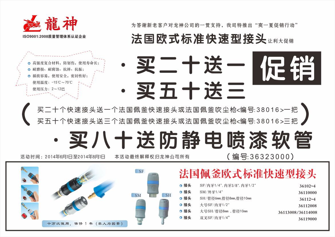 1、買二十送一(即買二十個(gè)快速接頭送一個(gè)法國(guó)佩釜快速接頭或法國(guó)佩釜吹塵槍(編號(hào):38016)一把)