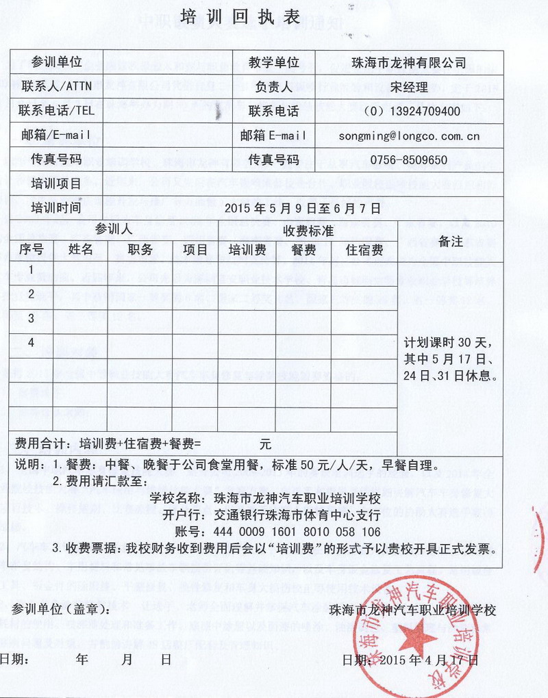 培訓(xùn)時(shí)間30天,即從2015年5月9日起至6月7日止,其中5月17日、24日31日休息;期間餐費(fèi)按照上課時(shí)間27天預(yù)收,實(shí)際參照離開時(shí)間調(diào)整。具體收費(fèi)情況請來電咨詢。