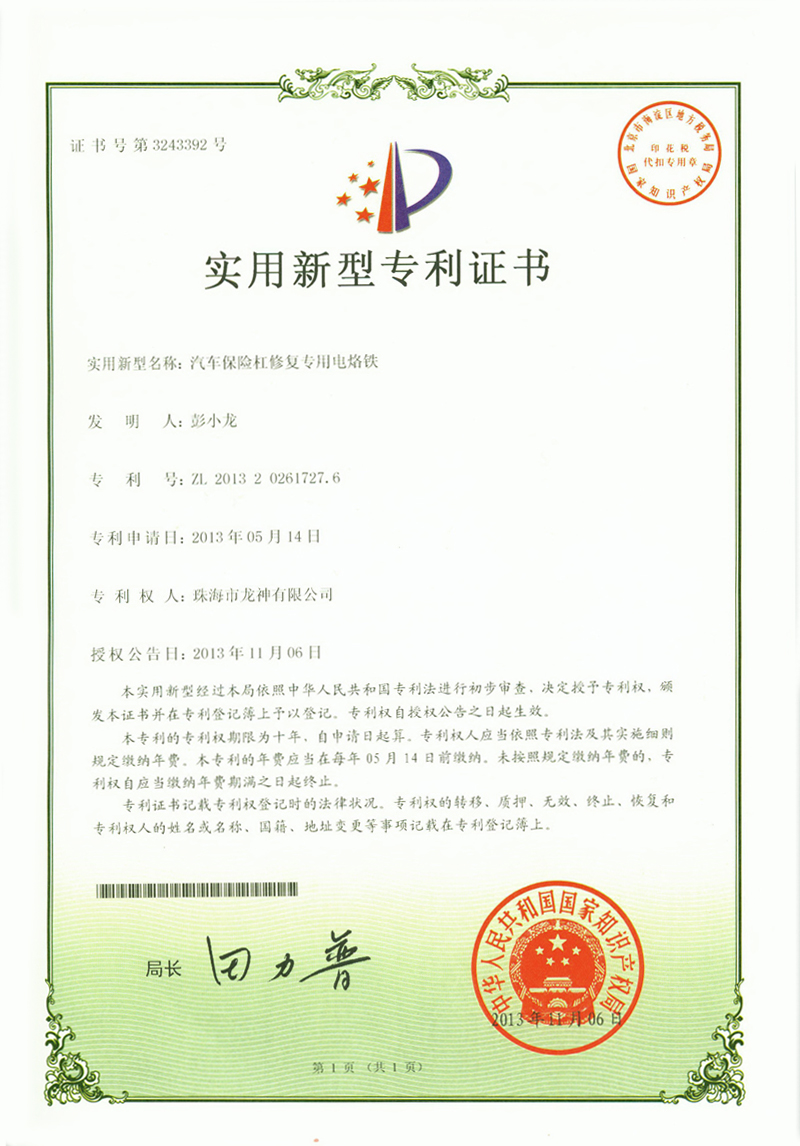 ![]() 噴槍清洗機(jī)專利證書 | ![]() 無靜電干燥加熱器專利證書 |