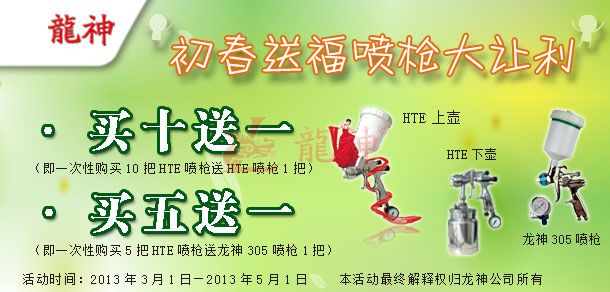 吉尼斯HTE噴槍“初春送?!贝黉N活動方案 2013-03-01 28068 吉尼斯HTE噴槍“初春送?!贝黉N活動方案 (產(chǎn)品編號:30282000-30286000) 2013年3月份市場促銷方案如下:一、主題:“初春送福”噴槍大讓利。二、活動時間:1、 時間:2013年03月1日至2013年05月1日 2、 時長:共計2個月 三、活動內(nèi)容:1、 買十送一(即一次購買十把HTE噴槍送一把HTE噴槍)2、 買五送一(即一次購買五把HTE噴槍送一把龍神305噴槍)四、具體操作方案 1、購買十把HTE噴槍送一把HTE噴槍 2、買五把HTE噴槍送一把龍神305噴槍 (以上二個方案具體促銷方式可按增量的形成搭配)