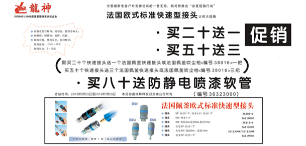 法國佩釜快速接頭“冰夏”讓利大促銷 2013-05-13 18769 法國佩釜快速接頭促銷方案(產(chǎn)品編號:36102000-36119000)一、主題:“冰夏”促銷行動 二、目的:回饋新老客戶,讓利大反饋 三、時間:1、 啟動時間:2013年5月13日 2、 結(jié)束時間:2013年7月13日3、 時長:2個月 四、活動內(nèi)容:1、 買二十送一(即買二十個快速接頭送一個法國佩釜快速接頭或法法國佩釜吹塵槍(編號:38016)一把) 2、 買五十送三 3、 買八十送防靜電噴漆軟管(編號:36323)五、其它 1、本活動最終解釋權(quán)歸珠海龍神所有。